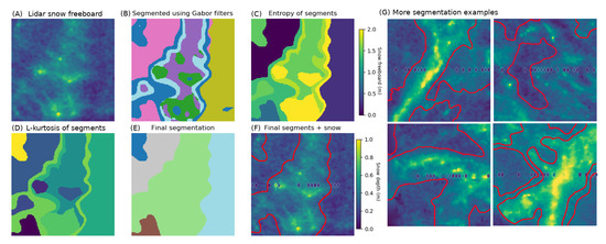 Example of the textural segmentation algorithm. The 180 m × 180 m lidar window (A) is normalized, essentially making it like a grayscale (i.e., monochrome) image. This is segmented using Gabor filters (B). The image entropy (C) and L-kurtosis (D) of each segment is shown; ‘similar’ ones are merged together recursively until a final segmentation (E) is obtained. The segments, along with the snow depth measurements (diamonds) are shown in (F). We deliberately choose to over-segment in (B), as it is easy to merge small segments. More examples of the segmentation algorithm are shown in (G).