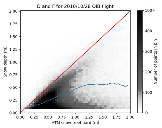 A histogram showing the point density for different F and D values. F is binned at 3.3 cm and D is binned at 3.7 cm. The line is shown in red, and the mean value of D for each F bin is shown with the blue line. This can be used as a interpolating empirical function for determining D, i.e., ) = D e.g., [9]. At higher F values, the mean D may give a biased estimate of the snow depth as the true distribution is bimodal.