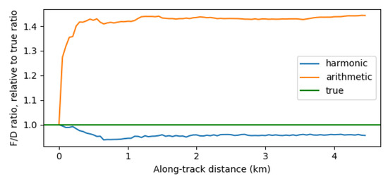 The convergence of the harmonic and arithmetic means, vs. the ‘true’ mean ((mean F)/(mean D)), averaged over 58 segments that spanned at least 4.5 km. There is a tendency for the harmonic mean to slightly underestimate the true mean ratio by 3%.