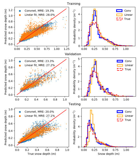 Training, validation and test results for predicting snow depth (averaged over a 180 × 180 m window) with a ConvNet. The training/validation sets are randomly sampled from the 28 October 2010 dataset, and the test set is the 17 October 2016 dataset. The linear fit is fitted to the training set only, and then applied to the validation and test sets. The resulting snow depth distributions for each model is shown in the right panels. For comparison with other studies that use RMS error, our training/validation/testing RMS errors are 4.6/5.9/4.4 cm.