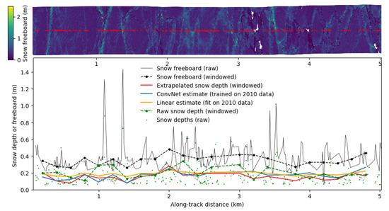 An example flight segment from the 2016 dataset. Top panel: the snow depths (red dots) and snow freeboard (lidar swath). Bottom panel: the snow freeboard (black solid line) and snow depth measurements (green points), along with their meaned values within a lidar window (black and green dotted lines). Also shown is the extrapolated snow depths (red, for the entire width of the lidar scan, instead of just the snow radar footprint), and the predicted snow depths using a linear model and a ConvNet (orange and blue respectively—in both cases, trained/fitted on the 2010 dataset). Note that the raw snow freeboard (solid black line) are for the 9 m window of the snow radar footprint, whereas the mean snow freeboard (dotted black line) is for the corresponding 180 m lidar window. For the linear model, the mean relative error of this segment is 32%; for the ConvNet, it is 23%. The (extrapolated) mean snow depth for the 5 km segment is 15.5 cm; the ConvNet predicts 17.3 cm (12% error) and the linear fit predicts 18.9 cm (22% error). The mean of the raw snow depths (green) is 17.3 cm, which is coincidentally the same value as our ConvNet average, though it is likely biased high due to the 2–4 cm sampling bias for large-scale snow depths that was first mentioned in Section 4.1.