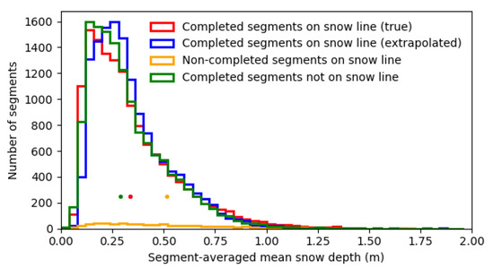 The distribution of true (red) and extrapolated (blue) mean snow depths D for successful and unsuccessful (orange) textural matches, for all segments that contain snow depth data (i.e., on the snow line), and the snow depth distribution of all successful extrapolations of those segments that did not have snow depth measurements (green). The mean segment D for all segments on the snow line that were successfully extrapolated (red dot) is 33.59 cm; the extrapolated mean (blue dot) is 33.60 cm; for non-completions (orange dot) it is 51.70 cm. The extrapolated mean snow depth for all segments that have no snow depth measurements (green dot) is 28.96 cm. The true mean snow depth of the snow line, with both completions and non-completions, is 34.2 cm (not shown).