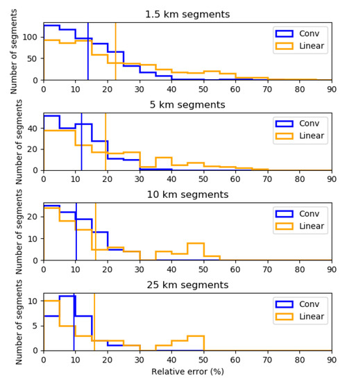 Relative error distribution of estimating the mean snow depths, at various length scales, using the linear/ConvNet models fitted to the training set (2010 OIB dataset), and applied to the test set (2016 OIB dataset). The vertical lines show the mean relative error for the corresponding model. The ConvNet is consistently better than the linear fit, though the difference becomes less prominent as the segment size increases. The mean relative and absolute error for the ConvNet with 1.5 km segments are 14.0% and 2.9 cm.