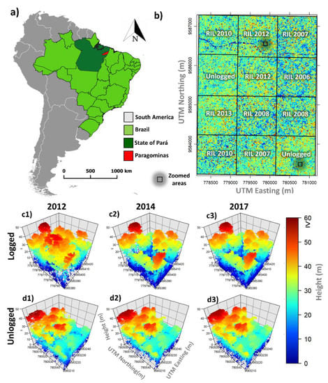 (a) Location map of the study area at Fazenda Cauaxi located in the eastern Brazilian Amazon; (b) LiDAR-derived canopy height model within the unlogged and reduced impact logging (RIL) work units (UT) of 100-ha each with colour ramp; and (c,d) LiDAR-derived point clouds across areas logged (c1–c3) by RIL or unlogged (d1–d3) in 2012 (c1,d1), 2014 (c2,d2), and 2017 (c3,d3) corresponding to the zoomed areas denoted in 1b and sharing the same colour ramp. Grid size in (c1–c3) and (d1–d3) is 10 m. The coordinate reference system for the study area is EPSG:4674.