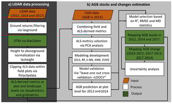 Figure 2 illustrates the research process that has been designed for estimating AGB stocks and AGB change using LiDAR data and statistical modeling approaches.