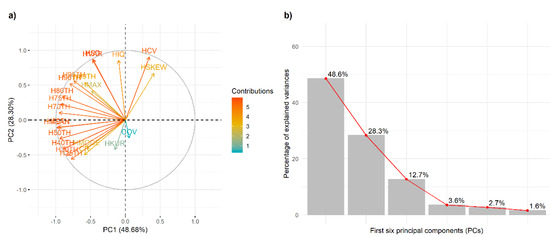 Principal Components (PC1 and PC2) and LiDAR metrics (a); The percentage of variation explained by the six first PCs (b).