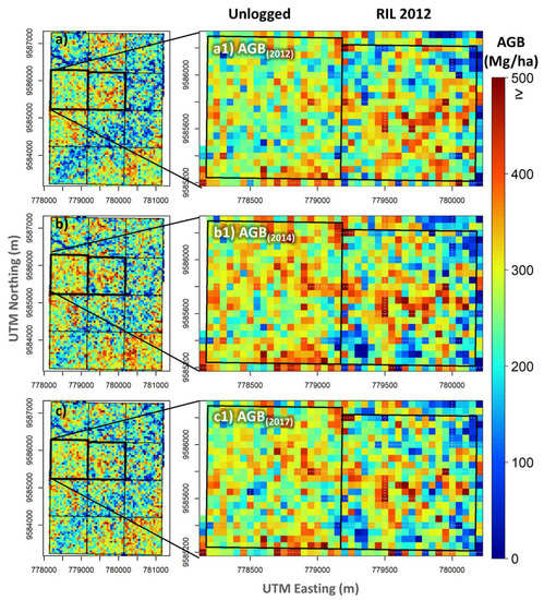 Aboveground biomass stock (AGB) within the unlogged and reduced impact logging (RIL) work units of 100-ha each in 2012 (a), 2014 (b), and 2017 (c). Zoom view of the AGB stock maps in areas unlogged and logged by RIL in 2012 (a1), 2014 (b1), and 2017 (c1).