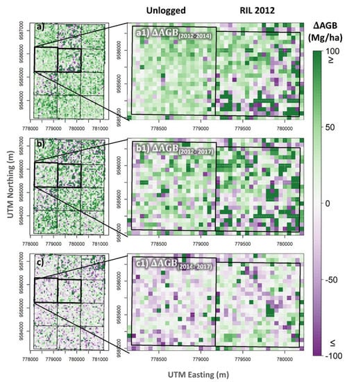 Map of aboveground biomass (AGB) change within the unlogged and reduced impact logging (RIL) work units of 100-ha each from 2012 to 2014 (a), 2014 to 2017 (b), and 2012 to 2017 (c). Zoom view of the AGB change maps in areas unlogged and logged by RIL (a1–c1).