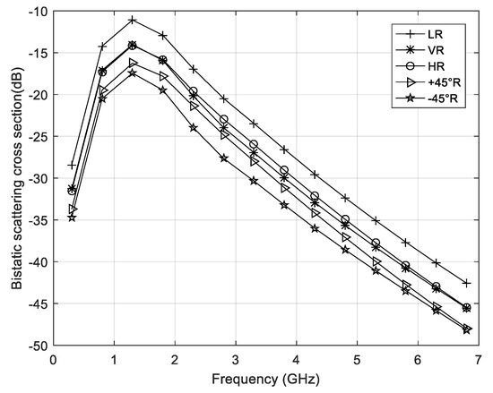 Variation of bistatic radar scattering cross section (BRCS) with frequency for five different polarizations.