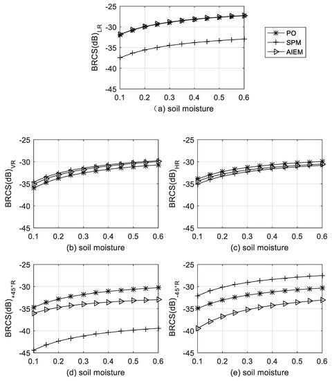 The soil texture, roughness, soil temperature, and soil moisture will affect the dielectric constant change, and then the BRCS. By using the developed models, the response of different soil parameters to BRCS can be simulated and analyzed. Figure 3 simulates the change of BRCS with soil moisture at P-band, 30° incident angle, 5° reflection zenith angle, and 120° scattering azimuth angle. It can be seen from Figure 3 that as the soil moisture increases, the BRCS of the five polarizations increase. For the LR polarization in Figure 3a, the results simulated by the PO model and the AIEM model are the same, and the results simulated by the SPM model are basically the same as those simulated by the PO and AIEM models. However, under each soil moisture condition, the BRCS difference is about 10 dB. In Figure 3, the VR and HR polarizations have little difference in the simulation results using the three models, and the trends are basically the same. As for +45° R polarization, the results of the SPM simulation and the PO and AIEM models have the largest difference. For −45° R, the difference between the simulation results of the three models is about 5 dB.