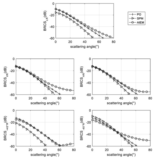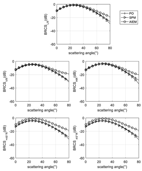 Figure 5 shows the variation of BRCS with the scattering zenith angle at a 30° incident angle and 120° scattering azimuth angles. With the exception of +45° R, the rest of the polarizations are simulated using the three models: PO model, SPM model, and AIEM model. The results are similar. As the scattering zenith angle increases, BRCS decreases. When the scattering zenith angle is greater than 45°, the results of the PO model simulation are too small to be ignored, and the results of the AIEM simulation increase slightly after a large angle. As the scattering zenith angle is larger than 65°, the BRCS simulated by SPM model becomes very small. It can be seen from the simulation results that the effect of the AIEM model is better.