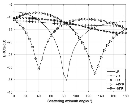 Figure 7 shows the relationship between BRCS and the scattering azimuth, the incident angle is 20°, and the scattering angle is 40°. It can be seen from the figure that the BRCS changes with different polarizations are quite different. For LR, +45° R and −45° R, the scattering azimuth decreases and then increases with the increase of the scattering azimuth angles. The scattering values of the three polarizations have grooves at different scattering azimuth angles. RV and RH polarizations show single change trends with the increase of scattering azimuth angles.