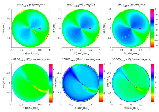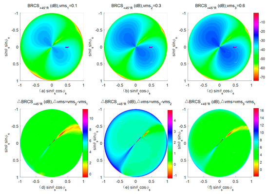 BRCS for different soil moisture contents (a–c) and the BRCS differences for different soil moisture differences (d–f) at +45° R polarization.