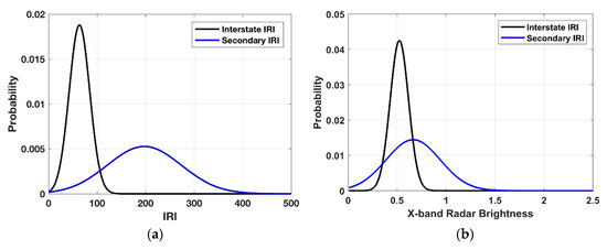 (a) Statistical distribution of IRI values for interstates (black) and secondary roads (blue) for our study area; (b) statistical distribution of radar brightness values by same road types.