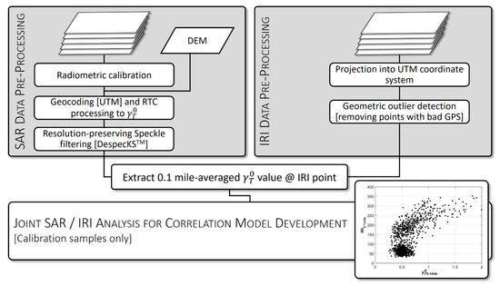 To facilitate a direct comparison with calibrated SAR data, all available IRI points were projected into the UTM coordinate system carried by the geocoded and radiometrically terrain-corrected SAR observations. Subsequently, the IRI points were imported into a GIS system, projected onto the preprocessed SAR images and overlain with road centerline data. A geospatial comparison of road center lines and IRI data points was performed to identify and remove IRI measurements that were mislocated from the pavement surface. Occasional geometric misplacements of IRI points were largely related to spurious errors in the recorded GPS coordinates. A removal of these points was necessary as the SAR values at the incorrect sampling locations are not representative of the IRI information measured for these points.