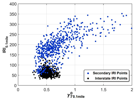 The color-coding of Figure 5 provides additional information about the vs. IRI data correlation by analyzing the influence of different road types on the correlation pattern. Similar to Figure 3, the data points associated with interstates form a tight cluster with little variance along both the IRI and axes. The circular shape of the interstate data cluster suggests little-to-no correlation between IRI and for this road type. For secondary roads, however, a significant correlation of IRI and X-band measurements can be observed.