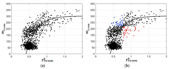 For the training set, the classification quality of the model in (1) for is shown in Figure 6b where correctly classified samples are shown in black while incorrect classifications (according to the IRI reference data) are shown in either blue (bad road segment incorrectly classified as good road; type-I error) or red (good road incorrectly classified as bad; type-II error). It can be seen that, while the majority of the data samples were classified correctly, there are some misclassifications near the decision threshold.