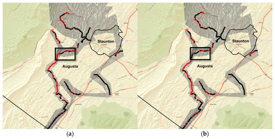 Our study is focused on Augusta County, VA, the second largest county by total area in the Commonwealth of Virginia (Figure 1). Augusta County is embedded within the Shenandoah Valley and surrounds the independent cities of Staunton and Waynesboro. As of 2019, the county had a population of 75,558 with an average population density of 76/mi2 [9]. The county’s people reside in near 30,000 households spread through two major towns and an additional 14 unincorporated communities. Augusta County has a maintenance jurisdiction for more than 1330 miles of road, with most belonging to the category of local secondary roads [10].