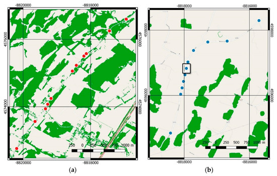 (a) Examples of locations affected by type-II errors (red markers) and their relationship to nearby tree stands (green-shaded regions). Most type-II errors are found in the direct vicinity of tree stands; (b) distribution of type-I errors along Glebe School Road, Augusta County, VA. The presence of type-I errors (bad road segments misclassified as good road segments) in a series of consecutive 0.1-mile road segments suggests road maintenance between the collection of the IRI and SAR data samples. The area marked by a black rectangle is further analyzed in Figure 10.