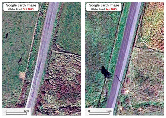 Comparison of the pavement conditions on Glebe School Road in October 2013 and September 2015. Significant rutting can be seen in the October 2013 image (left panel) increasing road surface roughness. This rutting appears largely mitigated in the September 2015 data set (right panel) due to the emplacement of a new pavement on the western side of the road. Image data provided by Google Earth. The location of these images is indicated by the rectangle in Figure 9b.