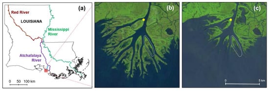 Study area. (a) The Wax Lake Delta (WLD, red square) is located at the terminus of the Wax Lake Outlet (blue line), which diverts water from the Atchafalaya River (purple line) in the U.S. state of Louisiana. The Atchafalaya is a distributary channel for the Mississippi (green line) and Red (red line) Rivers. (b) Image of WLD from 28-Sep-2010 by Landsat [88], for water level y = 0.35 m (NAVD88) at Camp Island gage (yellow dot) [93]. (c) Image of WLD from 24-Apr-2011 by Landsat [88], for water level y = 0.67 m (NAVD88) at Camp Island gage. WLD Pintail Island test case area outlined in white.