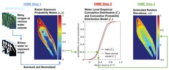 (1) First, a time series of empirical exposure probability models is developed for the region of interest. To do this, a large number of remote sensing images (N) is gathered over the region of interest. Water level change should occur at higher frequency than the morphological changes of interest. The N images are classified into binary maps of water versus non-water (emergent) areas. Areas classified as water are assigned value zero (0) and areas classified as emergent are assigned value one (1). Water is frequently separated from earth and vegetation in optical imagery using the NIR or red bands, which exhibit bimodal distributions in land/water scenes, and the Otsu thresholding method [94] is effective at finding the optimal value(s) to divide a multi-modal histogram into distinct classes (e.g., [95]). We used the Otsu method on the red band (if necessary in RGB-only image) or Band 5 (as recommended by others for distinguishing water in a multiband image [90]) to divide water and non-water pixels. Emergent areas consisted of subaerial sediment or vegetation cover, representing the top of the marsh (“marsh-top”) as viewed from above. Other classification approaches could be adopted without changing the overall sense and framework of the HIME method. As implemented in this study, the HIME method does not distinguish the marsh sediment and vegetation surfaces, but focuses on distinguishing planform island and non-island areas, which is consistent with the most similar prior study of the system, by Allen et al. (2011) [90]. With this approach, the “marsh-top” elevations modeled by the HIME method may be higher than the islands’ sediment-surface elevations; however, the potential magnitude of this and other over- or under-estimations of HIME-modeled marsh elevation compared to true sediment surface elevation were assessed during method validation and found to be less than 0.04 m or <10% (see Section 3.1).