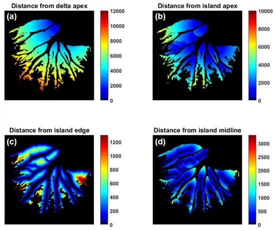 Example geometric position maps. Distance of each marsh pixel in the delta to (a) the delta apex, (b) its island’s apex, (c) its island’s nearest channel edge, (d) its island’s central axis (i.e., midline, starting ¼ of the way down the island from the island apex). Units for each variable are meters. Examples shown for the 2011–2013 timeframe.
