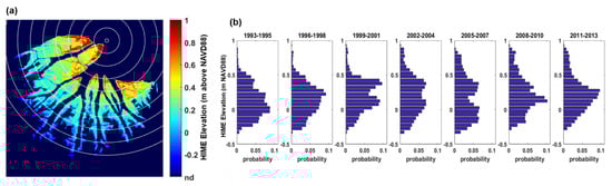 (a) Map of HIME marsh-top elevations for WLD in the 2011–2013 timeframe. Maps for the other six timeframes are in the Supplementary Materials, Figure S3. (b) Time series of probability distributions of WLD HIME elevations (in 0.05 m bins) from 1993–1995 (left) to 2011–2013 (right).