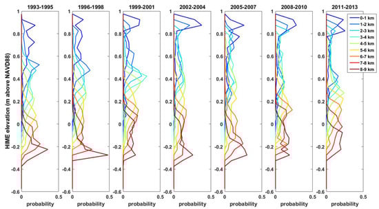 Probability distributions of WLD elevations (m, in 0.05 m bins) in each 1 km-band of distance from the delta apex (color-coded), and change within each band over time (panels, left to right).
