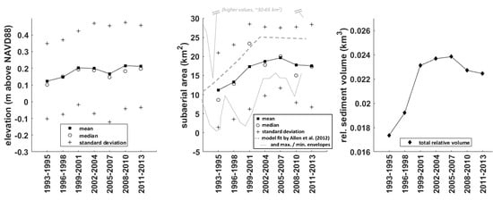 For the overall delta, the progressions through time of delta accretion (net positive elevation change), delta area (net subaerial progradation), and sediment volume (net subaerial accumulation) were also calculated from the HIME marsh-top elevation time series. For overall delta elevation, the basic descriptive statistics of median, mean, and standard deviation were evaluated based on all the pixels in the HIME model for each timeframe, as were histograms of elevations. For overall delta area, the count of pixels categorized as exposed marsh in each of the n images in a timeframe (i) was multiplied by 900 m2 (from 30 m pixel size) and the median, mean, and standard deviation of these n total areas was calculated for each timeframe (i). For net subaerial sediment volume, the single lowest HIME-derived elevation value in any timeframe was taken as a standard minimum (−0.325 m NAVD88), and the total relative sediment volume was calculated as the difference between each timeframe’s HIME marsh top elevations and this minimum, summed over the delta.