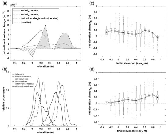 (a) Net change in WLD subaerial sediment volume over two decades, from the initial (1993–1995) to final (2011–2013) HIME timeframes of study, as experienced by discrete marsh top elevation zones (X-axis calculated as bins of z ± 0.05 m width); the marsh elevation zones (X-axis) were assessed for either the initial (elevi) or final (elevf) timeframe. Net sediment accumulation at a given elevation is shaded, net sediment volume loss is hatched. (b) Elevation histograms of occurrence of six key vegetation species/groups at WLD, as developed from a 400-point random sample of 30-m pixels on Pintail Island by Carle, Sasser, and Roberts (2015) [32]. Adapted from Carle, Sasser, and Roberts (2015). Reproduced with permission from the Coastal Education and Research Foundation, Inc, Seattle, WA, USA. (c) Boxplots of net HIME elevation change, as experienced by WLD pixels beginning within discrete elevation zones (zi ± 0.05 m) at the initial timeframe. (d) Boxplots of net HIME elevation change, as experienced by WLD pixels ending within discrete elevation zones at the final timeframe. Boxplots illustrate median (central points, connected by line), interquartile range (IQR: 25th to 75th percentiles as box bottom and top), 1.5 × IQR whisker lengths, and outliers (dots); boxplots are based on varying numbers of points per elevation zone. All elevations in meters NAVD88.