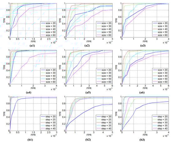 BSF and GSCR only reflect the background suppression and target enhancement abilities of detection method in a local region, not global image [23]. Therefore, to further verify the comprehensive detection performance of our algorithm, we obtained the ROC curves of those for the six sequences through experiments and compared them with the six other methods. In Figure 16, all the ROC curves are illustrated, and the corresponding AUC values are shown in Table 4. The ROC curve that is the closer to the upper left corner and has the larger AUC value represents the better detection performance. In Figure 16 and Table 4, it can be observed that the detection performance of Top-hat is the worst in most sequences (except for Sequence 4), due to that the simple structural elements cannot handle the complex background and varying target. LCM based on local contrast performs slightly better than top-hat. MPCM is a derived version of LCM, thus it has great performance improvement; however, its performance is still worse than PSTNN and the proposed method for all sequences. IPI works well, but its performance is fluctuating. RIPT can achieve good results in most cases, but its performance is slightly worse on Sequence 2, because it would over-shrink the target in some cases. Overall, PSTNN and the proposed method have achieved the two best results, but it can be clearly seen that our method almost invariably has maximal TPR value in respect of the identical FPR and has the largest AUC value. All these demonstrate the proposed method has the most robust detection performance.