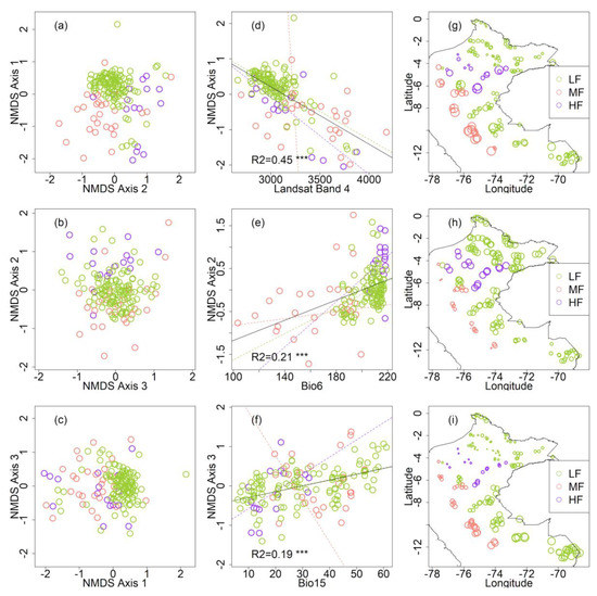 We first visualized the spatial patterns of floristic relationships and floristic variation across gradients of the main response variable (floristic ordination axes NMDS 1, 2, and 3) at the genus level (Figure 2). Based on the floristic ordination (Figure 2a–c), overall, there was a floristic gradient over plots within hydromorphic forests, mountain forests, and lowland forests.
