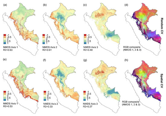 Despite the differences in the final set of variables selected, the spatial predictions of the floristic ordination axes (NMDS 1–3) were similar between the RF analyses using the two different cross-validation methods (Figure 3). Their pixel-level correlations were 0.90 for NMDS 1 (Figure 3a,e), 0.95 for NMDS 2 (Figure 3b,f), and 0.90 for the NMDS axis 3 (Figure 3c,g). This indicates that the results are reasonably robust, and for further analyses, we simply selected the models with the highest coefficient of determination and lowest RMSE, i.e., those based on forward feature selection and random cross-validation. The maps obtained when combining the predictions for all three NMDS axes (Figure 3d,h) suggest clear differences in the predicted tree genus composition for different parts of Peruvian Amazonia.