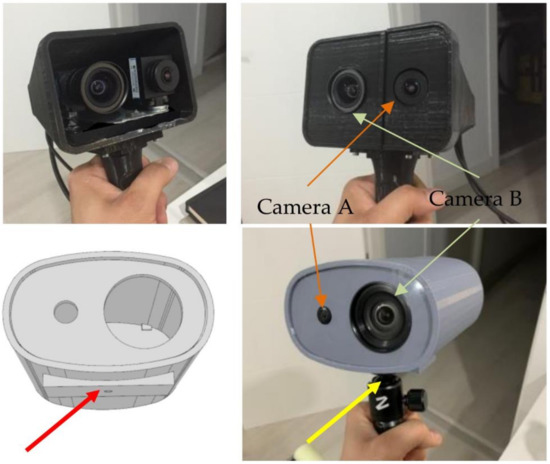 For data collection, the construction of a prototype was considered, using plastic material (acrylonitrile butadiene styrene, ABS), based on two cameras connected to a laptop in an ad-hoc designed housing for easy handling during field work. The first version of this prototype (P-1) incorporated two camera models from The Imaging Source Europe GmbH company (Bremen, Germany), each with a specific lens model: camera A (model DFK 42AUC03), with a model TIS-TBL 2.1 C lens (The Imaging Source Europe GmbH company, Bremen, Germany) (see Table 1), fulfilled the main mission of obtaining images for calculation of the real-time positioning of the capture system by the VSLAM algorithm; Camera B (model DFK 33UX264), with a Fujinon HF6XA–5M model lens (FUJIFILM Corp., Tokyo, Japan), was used to acquire the images, which were later used in the photogrammetric process. Although the first metric studies were satisfactory, it was observed that camera A had a higher resolution and performance than was required for the intended purpose, and that Camera B had a low dynamic range, such that it lacked optimal automatic adaptation to different lighting conditions; producing, in some cases, effects of excessive darkening of images. To solve these problems, a second prototype (P-2) was designed, with a lighter and smaller housing. Inside, two new cameras were installed next to each other, with parallel optical axes: The ELP-USB500W05G, manufactured by Ailipu Technology Co., Ltd. (Shenzhen, Guangdong, China), as camera A, and the GO-5000C-USB camera, manufactured by JAI Ltd. (Copenhagen, Denmark), as camera B. The main technical characteristics of the cameras used in both prototypes are given in Table 1.