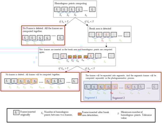 In this phase, we start from a set of images from cameras A and B with different characteristics (see Table 1). In order to ensure the consistency of the data that will be used in the photogrammetric process (camera images B), the following filters were designed [7]: (A) The AntiStop filter, with which it is possible to delete images where the user stopped at a specific point in the trajectory and the system continuously captured data, resulting in nearby positions. This filter is based on the calculation of distances between the camera centers of the keyframes, which are related to the shot times. In this way, the system detects whether the user has stopped and eliminates redundant keyframes; (B) the divergent self-rotation filter, which eliminates those keyframes that meet two conditions for at least three consecutive keyframes, and the angle of rotation of the camera with respect to the X and Z axes must increase its value by a maximum of ±9° and its projection centers must be very close; and C) the break area filter, which was specifically designed to detect whether there is less than a minimum value of homologous points in an image. The algorithm used to extract the main characteristics of the images is the so-called scale-invariant feature transform (SIFT), developed by Lowe (2004) [47]; in our case, the calculation is performed at low resolution (around 1 megapixel) at a speed of 2 images every 3.5 s, thus reducing the computational cost of the procedure. Figure 3 describes, in detail, the workflow followed in the application of the break area filter, the end result of which is that the images selected for incorporation into the photogrammetric process are grouped into a set of interrelated segments, where each forms a group of images connected to each other by a determined number of homologous points, guaranteeing the consistency and success of the photogrammetric process.