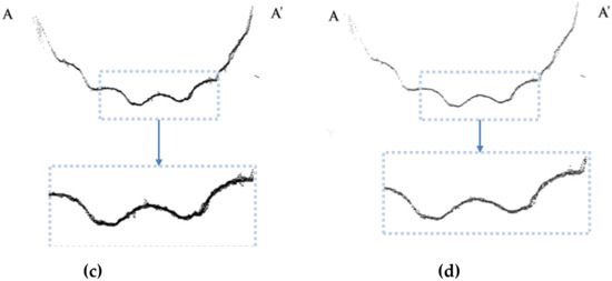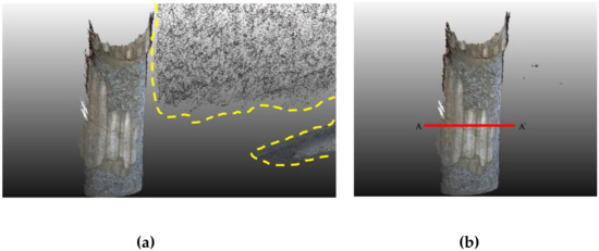 Effect of statistical outlier removal (SOR) and radius outlier removal (ROR) filters on a point cloud on the surface of a Roman column: (a) Point cloud with outliers in areas marked with dashed lines in yellow; (b) point cloud after applying the SOR filter, section AA is marked with a red line; (c) point cloud of section AA after applying the SOR filter; and (d) point cloud of section AA after the application of the SOR and ROR filters, with a better definition of the contour of the column section.