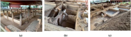 Work areas in the “Casa del Mitreo”: (a). Working area 1: Pond and Peristilium (left); (b). Working area 2: Underground rooms (center); and (c). Working area 3: Rooms with mosaic floors (right).