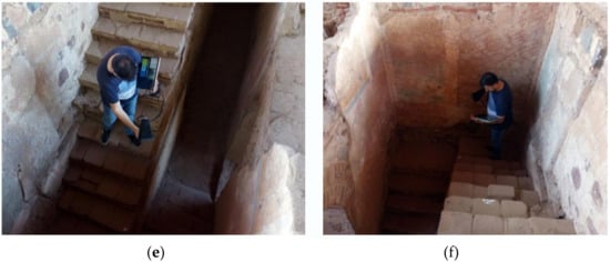 Working area 2: Underground rooms. This part of the house was used in the summer season. Being excavated below ground level, there was a lower temperature inside than in the upper area. These are accessed through a staircase with a narrow corridor, surrounded by high walls and with remains of paintings and notable differences in lighting between the lower and upper parts (Figure 5b). It was, therefore, an interesting area to study the behavior of the proposed system in narrow areas, as well as the adaptability of the system to different lighting levels and complex trajectories.