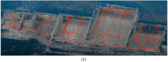 The photogrammetric procedure is applied independently to each of the segments obtained in the previous phases, and is structured in three steps: First, after a search for homologous points between the images of each segment (using the SIFT algorithm [47]), a filtering process is performed using a random sample consensus algorithm (RANSAC) [48]. The search for homologous points is carried out in the following three grouping criteria: (1) In the set of images that form the starting image with four previous images and four subsequent images, (2) in the set of images characterized by their proximity according to data from the trajectory calculated with the VSLAM algorithm, and (3) in all the images of the segment. Each criterion has a different computational cost, less in criterion 1 and more in criteria 2 and 3. The choice of criterion depends on the intake conditions; thus, if the user makes a trajectory in a single direction, it is appropriate to use criterion 1. In the case of trajectories in several directions, in which the user passes through the same place several times, we can use criterion 2; although, we obtain a more robust solution with criterion 3, albeit with a higher computational cost.
