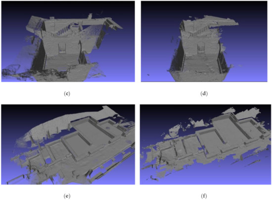 Comparison of the point cloud resulting from the LS Faro Focus3D X 330 (a,c,e) and the proposed system (b,d,f) of working area 1 (a,b), working area 2 (c,d), and working area 3 (e,f). Visualization was carried out in Meshlab [52] with a homogeneous normal calculation for both systems, with the aim of eliminating textures and favoring a balanced geometric comparison.