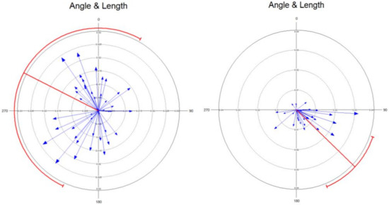 With these data, we obtained the descriptive statistics of Table 5 and, further, we used the Oriana v4 software (Kovach Computing Services, Anglesey, Wales) to obtaining the data in Table 6, in which it can be observed that the values obtained for the mean modulus were relatively low (0.13 and 0.56 for samples M1 and M2, respectively), compared to the minimum and maximum values of 0 and 1 between which it can oscillate. Therefore, we can rule out the existence of a preferred data address. Likewise, the concentration parameter (κ) presented values of 0.27 and 1.35, far from the value 2, which would indicate the concentration of data. Another indicator of vector dispersion were the high values reached by the circular standard deviations of the samples (115.3° and 61.9°, respectively). Therefore, we are assured that, in both statistical samples, the error vectors were not grouped, they did not follow a preferential direction, and there was no unidirectionality in the data. Likewise, there was a high probability that the data were evenly distributed in M2, with a lower probability in M1. In Figure 9, the modules and azimuths referring to a common origin are represented to evaluate both their orientation and their importance. From the above, it follows that we can reject the existence of systematic errors between both systems.