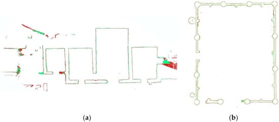 Overlapping cross sections generated in both point clouds, obtained using a horizontal plane at a height of 0.50 m above the ground. The result of the section of the cloud captured by the laser scanner appears in red, and that with the proposed system in green: Work zone 1 (a) at scale 1/235; and work zone 3 (b) at scale 1/180.