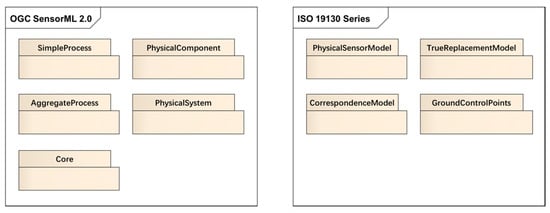 According to the World Meteorological Organization (WMO) [2], approximately 950 types of remote sensors (including both Earth observation instruments and solar/space environment monitors) have been deployed on more than 700 satellites up to 2019. Because of the diversity of sensor types, data from different producers may contain different parametric information, lack parameters required to describe the sensor, or lack ancillary information necessary for geo-positioning and analyzing the data. A more standard way to describe sensors and platforms can enable intelligent discovery of the right sensor at the right time and location with the right quality, which also improves sensor interoperation [3]. Figure 1 presents an overview of the UML packages defined in two important sensor model related standards: OGC SensorML and ISO 19130-1/19130-2.