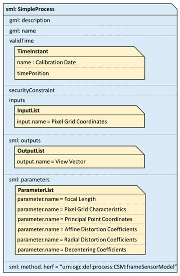 Although SensorML does not rigorously specify any semantic model for geo-positioning, it enables users to define sensor models using SensorML’s processes model. Botts [22] gives an example of how to describe a frame sensor model using SensorML 1.0. The encoding implementation of this example frame sensor model is shown in Figure 2. The full XML code of this example can be found in Annex B of OGC 08-071 document [22].