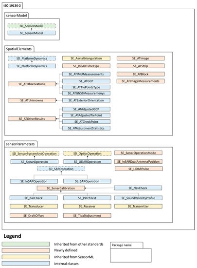 The mapping results form into a new schema. Figure 8 and Figure 9 illustrate the resulting proposed specification of ISO 19130-3. They also show how schemas are organized and defined. It is a profile of SensorML named as ISO 19130-3 under ISO 19130-1 and ISO 19130-2 semantics. Classes with similar functions and same prefix are put together in one package (a package is a group of semantically related elements [25]). The general SD_SensorModel class describing the basic sensor model is in the sensorModel package. The physicalSensorModel (PSM) and nonPhysicalSensorModel (including TRM and CM) are put in two separated packages. The groundControlPoints is a package containing GCP-related classes. The two most informative packages are spatialElements and sensorParameters. The sensorParameters is a group of parameters to define or set for a component or system. It consists of sensor parameters, distortion, detector array, sensor, sensor operations, microwave, calibration, transducer, receiver, and transmitter. The elements in spatialElements package describe spatial information, including position, attitude, dynamics, orientation, and aerial triangulation information. In Figure 8 and Figure 9, all classes in yellow are inherited from SensorML classes and classes in blue are their child classes. Classes in light orange are newly defined because of their unique properties or definitions. Finally, classes in light green are imported and extended from other standards, such as ISO 19115 Geographic Information — Metadata — Part 2: Extensions for Acquisition and Processing [24] and OGC SWE Common Data Model Encoding Standard [26].