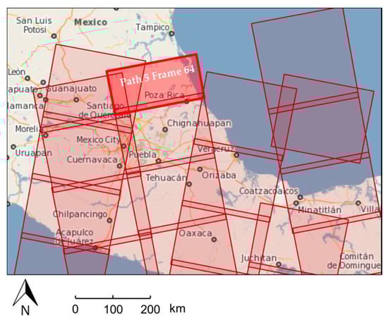 To directly show how to implement the schemas on an actual remote-sensing image for a geo-positioning process, a level-1 image (downloaded from Copernicus Sentinel data 2019, processed by ESA.) from Sentinel-1 satellite is given as an example [27]. The example image was acquired on 30 July, 2019 of path 5, frame 64 (Figure 10, path and frame denote the image position in Sentinel-1’s reference system).
