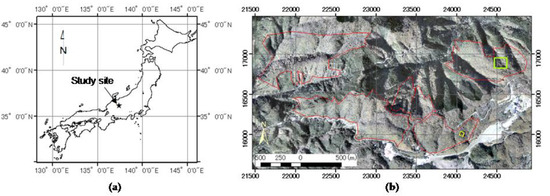 Study site. (a) Location in Japan; (b) Locations within the deciduous broadleaf forest. The red polygons show the broadleaf forest and the yellow polygon shows the location of an unmanned aerial vehicle (UAV) flight area. The lime square shows the area of gap lifespan prediction maps in Section 3.4. (Background: an aerial ortho-photo captured in October 2016).