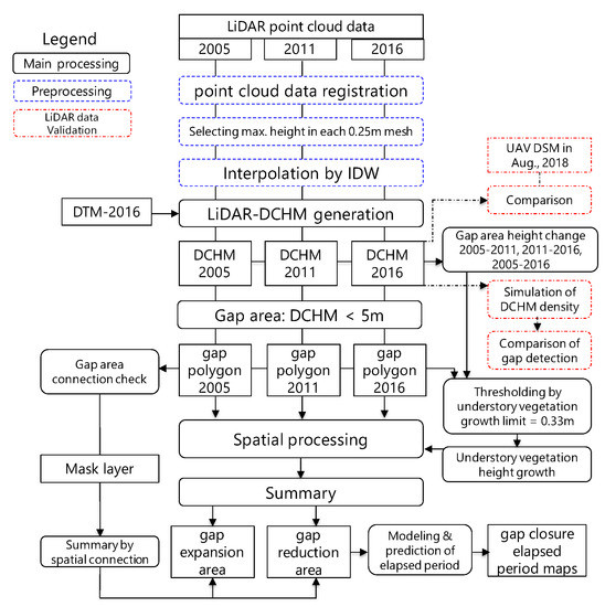 Figure 2 shows a flowchart of the analysis procedure, which consisted of four parts: (1) generating DSMs and DCHMs from the LiDAR data; (2) validating the compatibility of the generated DSMs; (3) time-series tracking of gap generation and canopy closure; and (4) modeling gap area reduction.