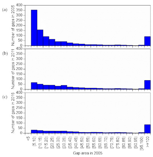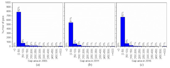Number of gaps by area class. (a) Gaps in 2005; (b) gaps in 2011; (c) gaps in 2016.
